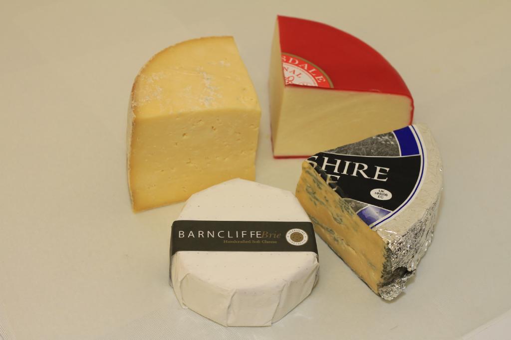 This selection of Yorkshire cheeses includes 200g each of Barncliffe Brie from Huddersfield, Yorkshire Blue, Coverdale and Wensleydale with Ginger.