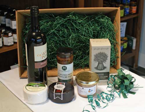 This fluted box hamper contains a bottle of red wine, Snowdonia Black Bomber 200g cheddar cheese truckle, Traditional Yorkshire Wensleydale cheese truckle, Mollie Sharp's chicken liver paté, Mollie Sharp's caramelised onion chutney and charcoal crackers.