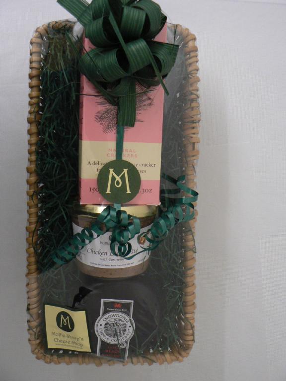 This wicker gift pack contains a 200g Snowdonia Black Bomber cheddar cheese truckle, Natural Crackers and Mollie Sharp's Chicken Liver Paté.Items may sometimes be substituted for similar products if out of stock.
